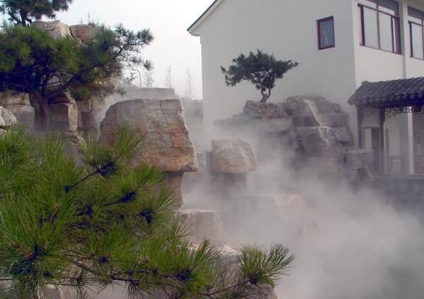 應(yīng)用于園林景觀效果,人工造霧以改善空氣質(zhì)量,美化環(huán)境為依托,以景觀、保濕、防塵、降溫、造景為目的,在自然園林、環(huán)境景觀方面應(yīng)用廣泛,如景區(qū)、廣場、公園、綠化工程、舞臺、連廊、休息亭、室內(nèi)外餐廳等各領(lǐng)域。當微風拂過,霧形上下騰涌,霧濃似云海般飄渺,云起云聚,霧淡如輕紗撫面,溫和柔美。人們不僅可以在遠處觀賞,體會那若穩(wěn)若現(xiàn)的神秘之感,更可置身于的茫茫霧海中,呼吸其濕潤新鮮的空氣,神奇之處令人意趣無窮。